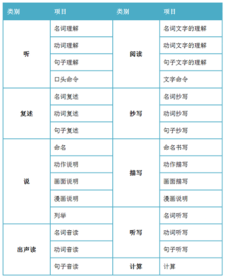 语音理解,文字阅读,文字音读,语音复述,文字听写,文字抄写,图片说明,文字听选,漫画说明。